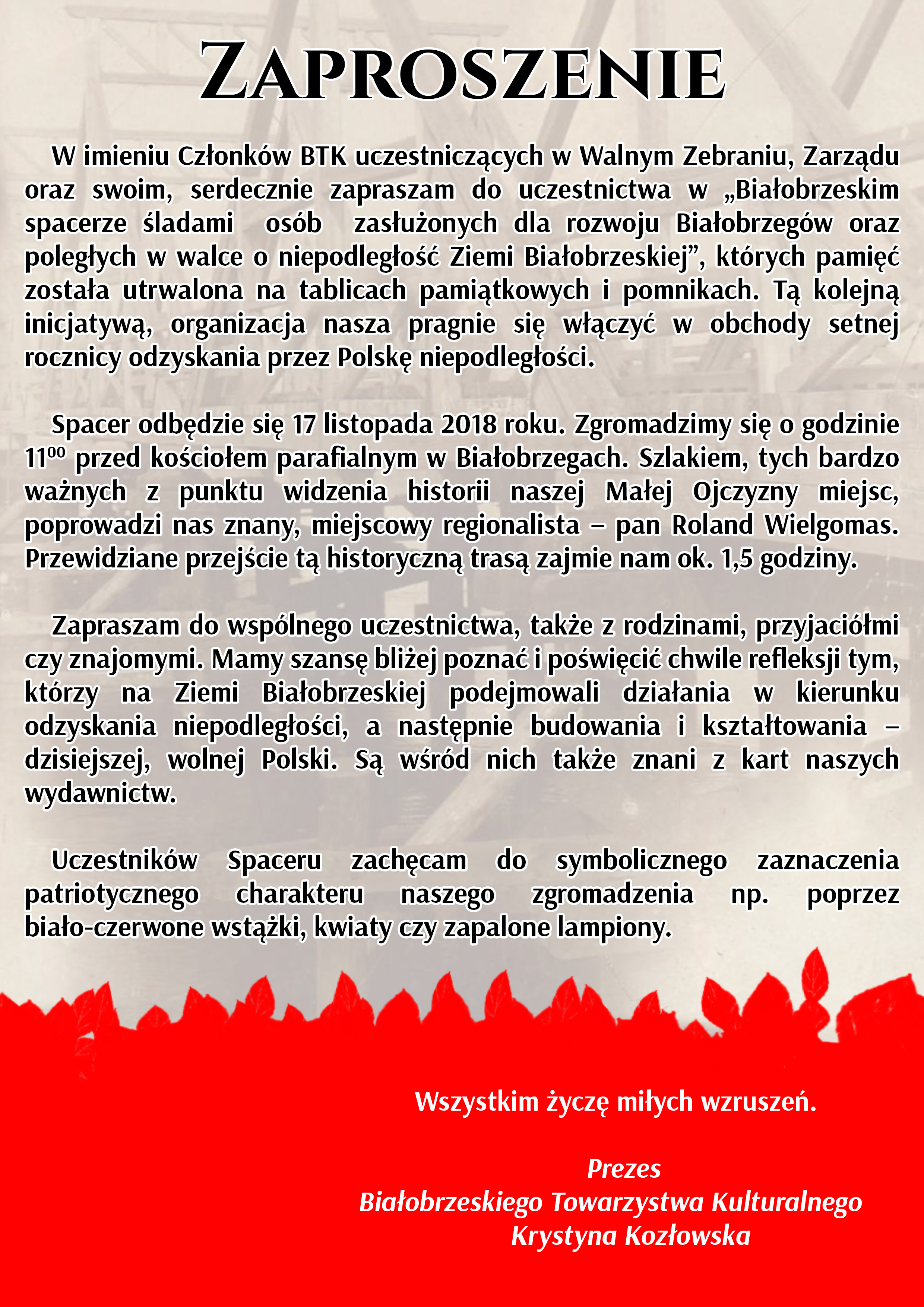 Włączając się do uroczystych obchodów 100 rocznicy odzyskania przez Polskę niepodległości, Białobrzeskie Towarzystwo Kulturalne 17 listopada 2018 roku zorganizowało spacer śladami osób zasłużonych dla rozwoju Białobrzegów oraz poległych w walkach o niepodległość Polski. Ich pamięć została wcześniej utrwalona w formie tablic pamiątkowych i pomników, urządzonych staraniem różnych osób, środowisk i władz miasta, a także w wydawnictwach lokalnych. Zaś uczestniczący w spacerze mieli szansę by okazać pamięć i wdzięczność Tym, którzy to miasto tworzyli, i Tym, którzy złożyli ofiarę ze swojego życia, aby przyszłe pokolenia mogły żyć w wolnym Kraju. Inicjatorką i autorką scenariusza spaceru była Zofia Boczek, członek BTK, autorka wielu inicjatyw społecznych na rzecz Białobrzegów.